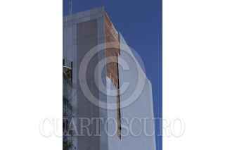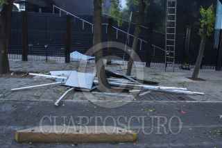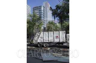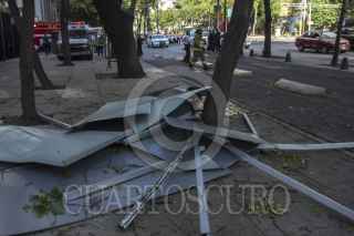 MÉXICO, D.F., 06ABRIL2014.- Laminas que cubrían el costado de un edificio ubicado en avenida Reforma, frente al Senado de la República, se cayeron tras un fuerte viento que se registro, llevando el material a la acera de enfrente sin causar algún lesionado. FOTO: ENRIQUE ORDÓÑEZ /CUARTOSCURO.COM