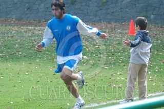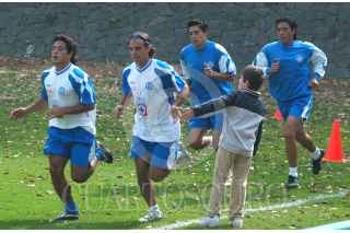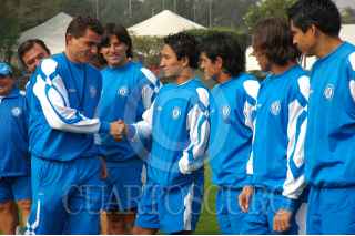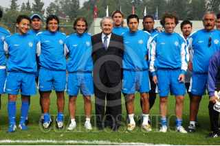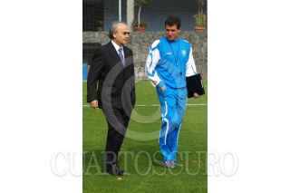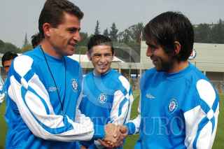 MÉXICO, D.F. 19DICIEMBRE2005.- Isaac Mizrahi saluda a César "Chelito" Delgado durante la presentación donde se hizo oficial su integración como nuevo director técnico de la máquina del Cruz Azul. FOTO: Iván Stephens/CUARTOSCURO.COM