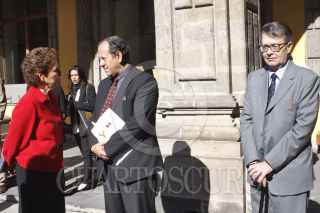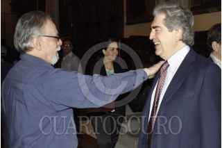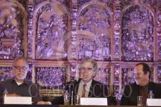 MÉXICO, D.F., 09ABRIL2014.- David Huerta, poeta y escritor, Rafael Tovar y de Teresa, director del Conaculta y Eduardo Vázquez Martín, secretario de Cultura del DF, durante la conferencia de prensa en la cual se anunció las actividades por el centenario del natalicio de Efraín Huerta, la reunión se realizó en Antiguo Colegio de San Ildefonso. FOTO: MOISÉS PABLO /CUARTOSCURO.COM