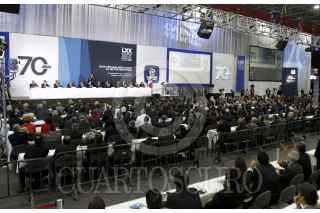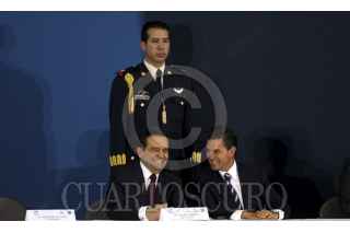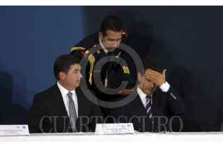 MONTERREY, NUEVO LEÓN, 09ABRIL2014.- Se llevó a cabo la LXX Asamblea Anual Ordinaria Caintra, donde empresarios del estado acudieron a la toma de protesta encabezada por el Presidente de México Enrique Peña Nieto, la cita fue en la sede de CINTERMEX. En la imagen el Jefe de Ejecutivo conversa con Ildefonso Guajardo, secretario de Economía. FOTO: GABRIELA PÉREZ MONTIEL / CUARTOSCURO.COM