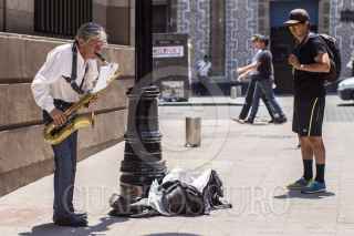 MEXICO, D.F., 13ABRIL2014.- Un hombre se detiene a escuchar la música que brota del saxofón de un músico callejero, en el Centro Histórico de la Ciudad de México. FOTO: DAVID POLO /CUARTOSCURO.COM