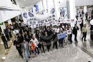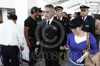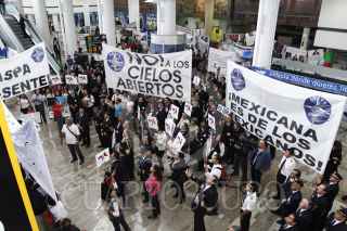 MÉXICO, D.F., 15ABRIL2014.- Carlos Manuel Díaz Chavez, lider de la Asociación Sindical de Pilotos de Aviación durante la protesta dentro de la Terminal 1 del Aeropuerto Internacional de la Ciudad de México contra la quiebra de la aerolínea Mexicana de Aviación. FOTO: RODOLFO ANGULO /CUARTOSCURO.COM