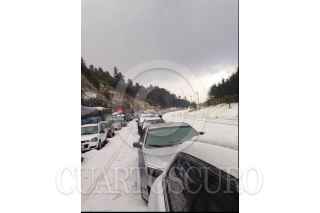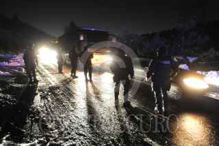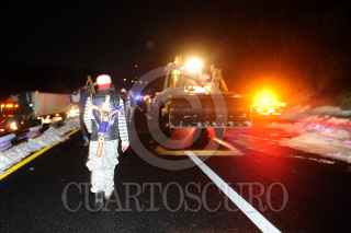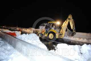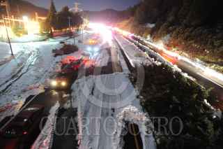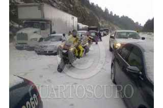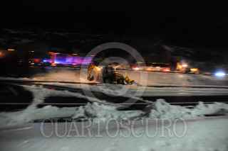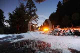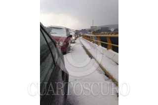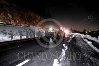 MÉXICO D.F; 17ABRIL2014.- Personal del Ejército, Policía Federal, Estatal y local, así como de Protección Civil y Cruz Roja, relazaron labores de limpieza en las carreteras que conectan la capital del Estado de México con el Distrito Federal, la cual quedo tapizada en Granizo de la intensa tormenta que azoto ayer la zona de Cuajimalpa. Dejando varados cientos de vehículos en ambos sentidos. Alrededor de las 5 AM se logro habilitar un carril en estas carreteras para desahogar el tráfico, apoyado por trascabos y palas para retirar el hielo de la carpeta asfáltica de estas carreteras. FOTO: LUIS CARBAYO /CUARTOSCURO.COM