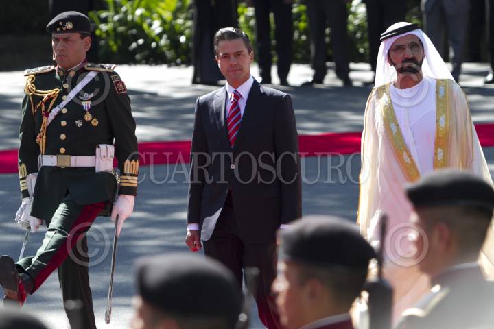 MÉXICO D.F., 21ABRIL2014.- Luis Videgaray titular de la secretaria de Hacienda y Gerardo Ruiz Esparza, Secretario de Comunicaciones y Transportes, al final de la ceremonia de bienvenida oficial del Jeque Mohammed Bin Rashid Al Maktoum, Primer Ministro y vicepresidente de los Emiratos Árabes Unidos, en la explanada Francisco I. Madero de la Residencia oficial de los Pinos. FOTO: GUILLERMO PEREA /CUARTOSCURO.COM