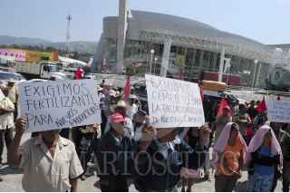 CHILPANCINGO, GUERRERO, 23ABRIL2014.- Campesinos de la región Centro, Montaña y Costa chica que integran el Movimiento Antorchista Nacional (Antorcha Campesina) con pancartas en mano se manifestaron en el palacio de gobierno para exigir fertilizantes, despensas y rehabilitación de caminos, así como una audiencia y sentenciaron en caso de no concederles el gobierno estatal la audiencia bloquearan avenidas. FOTO: JOSÉ I. HERNÁNDEZ /CUARTOSCURO.COM
