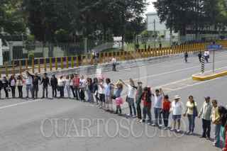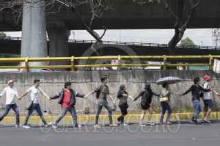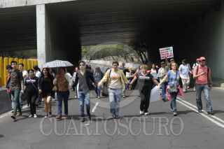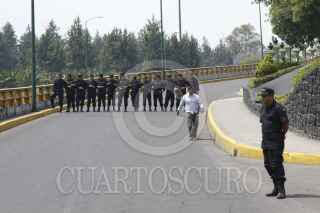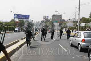 MÉXICO, DF., 26ABRIL2014.- Ciudadanos se reunieron en la entrada de la residencia Oficial de Los Pinos, ubicada en Parque Lira y Constituyentes, para encabezar una cadena humana en rechazo a las leyes secundarias de Ley de Telecomunicaciones que se discute en comisiones en el Senado de la República, los manifestantes acusan al gobierno de querer censurar los contenidos en Internet, elementos del Estado Mayor les impidieron el paso con vallas por lo que los manifestantes tuvieron que meterse al arrollo vehicular para poder bajar hacia la entrada de Chivatito y así poder reunirse con el grueso de los manifestantes. FOTO: MOISÉS PABLO /CUARTOSCURO.COM