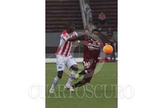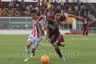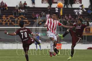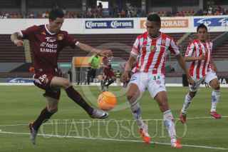 ZAPOPAN, JALISCO, 26ABRIL2014.- Esta noche en el Estadio 3 de Marzo y en partido correspondiente a las Semifinales de vuelta de la Liga de Ascenso MX 2014, se enfrentan los equipos de Estudiantes Tecos frente a los Rayos del Necaxa. En la imagen el jugador de Necaxa Michel García, disputa un balón frente al contrario de Estudiantes, Elgabry Rangel. FOTO: FERNANDO CARRANZA GARCIA /CUARTOSCURO.COM