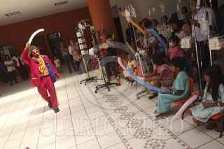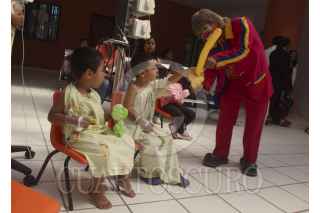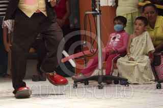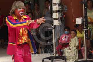 SAN BARTOLO COYOTEPEC, OAXACA, 28ABRIL2014.- Un grupo de payasos que integran la organización de "Amigos en recuperación" y que llevan a los hospitales la "risoterapia" se presentaron en el Hospital de la Niñez Oaxaqueña Dr. Guillermo Zárate Mijangos donde divirtieron a los pequeños que se encuentran internados en el nosocomio, esto como parte de las festividades del día del niño. FOTO: ARTURO PÉREZ ALFONSO /CUARTOSCURO.COM