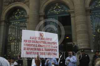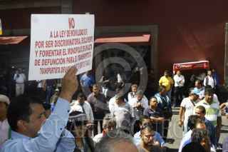 MÉXICO, D.F., 29ABRIL2014.- Organizaciones de transporte concesionario se manifestaron en oposición a la llamada Ley de Movilidad del DF afuera de la Asamblea Legislativa del DF, cual acusan de promover los monopolios en este rubro. FOTO: MOISÉS PABLO /CUARTOSCURO.COM