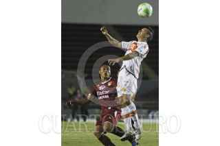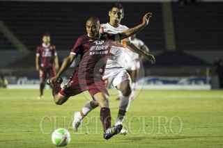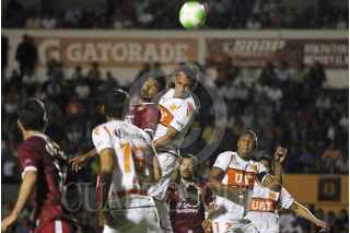 ZAPOPAN, JALISCO, 01MAYO2014.- Ayer por la noche los Correcaminos de la UAT y los Estudiantes Tecos se enfrentaron en el partido correspondiente a las finales de ida del Torneo Clausura 2014 de la Liga de Ascenso MX en el Estadio 03 de Marzo. En la imagen el jugador de Estudiantes Taufic Guarch se disputa el balón frente al contario de Correcaminos, Pierre Ibarra. FOTO: FERNANDO CARRANZA GARCIA /CUARTOSCURO.COM