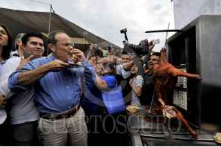 MÉXICO, D.F., 01MAYO2014.- El dirigente panista Gustavo Madero, quien busca la reeelección para la presidencia del PAN, disfruta de un taco de cordero asado durante un evento realizado en el deportivo Santa Cruz Meyehualco, en donde lo estuvo acompañado de diputados locales y federales. FOTO: CUARTOSCURO.COM