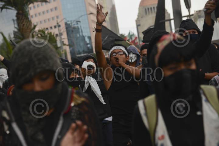 MÉXICO, D.F., 01MAYO2014.- Jóvenes autodenominados anarquistas realizaron una manifestación partiendo del Monumento a la Revolución, con destino al Zócalo Capitalino, para posteriormente partir rumbo a televisa chapultepec. Al llegar a las inmediaciones de televisa, el contingente, reducido en número ya, retornó al metro pues las instalaciones de la televisora estaban ya rodeadas de elementos policiales del GDF. Los anarquistas marcharon para conmemorar a "Los Mártires de Chicago", cinco trabajadores anarquistas sentenciados a muerte en el siglo XIX en la ciudad de Chicago, tras participar en las manifestaciones obreras que reivindicaban la jornada laboral de 8 horas, el primero de Mayo de 1886. FOTO: PEDRO ANZA /CUARTOSCURO.COM
