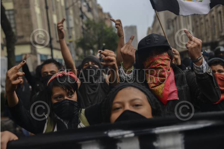 MÉXICO, D.F., 01MAYO2014.- Jóvenes autodenominados anarquistas realizaron una manifestación partiendo del Monumento a la Revolución, con destino al Zócalo Capitalino, para posteriormente partir rumbo a televisa chapultepec. Al llegar a las inmediaciones de televisa, el contingente, reducido en número ya, retornó al metro pues las instalaciones de la televisora estaban ya rodeadas de elementos policiales del GDF. Los anarquistas marcharon para conmemorar a "Los Mártires de Chicago", cinco trabajadores anarquistas sentenciados a muerte en el siglo XIX en la ciudad de Chicago, tras participar en las manifestaciones obreras que reivindicaban la jornada laboral de 8 horas, el primero de Mayo de 1886. FOTO: PEDRO ANZA /CUARTOSCURO.COM