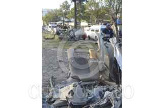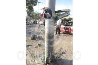 MÉXICO, D.F., 02MAYO2014.- Una camioneta X Trail se despedazo en su totalidad al estrellarse contra un poste de acero en la av. Zaragoza, esto entre avenida Telecomunicaciones y Guelatao en Iztapalapa. El conductor de aproximadamente 30 años murió en el lugar desprendiéndosele una pierna por el tremendo impacto. FOTO: LUIS CARBAYO /CUARTOSCURO.COM