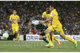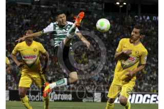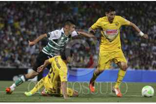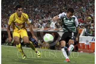 TORREÓN, COAHUILA, 03MAYO2014.- Oribe Peralta del equipo del Santos Laguna se disputa el balón contra Pablo Aguilar del equipo de las Águilas del América en el Estadio Corona, partido correspondiente a la vuelta de cuartos de final de la Clausura Liguilla MX. FOTO: GABRIELA PÉREZ MONTIEL /CUARTOSCURO.COM