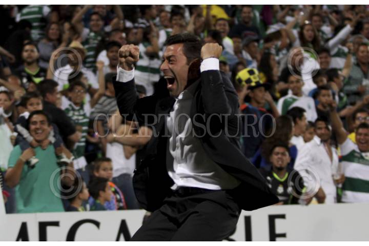 TORREÓN, COAHUILA, 03MAYO2014.- Pedro Caixinha director técnico del Santos Laguna celebra el triunfo del pase a las semifinales en el Estadio Corona, partido correspondiente a la vuelta de cuartos de final de la Clausura Liguilla MX. FOTO: GABRIELA PÉREZ MONTIEL /CUARTOSCURO.COM