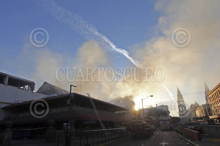 GUADALAJARA, JALISCO, 05MAYO2014.- Personal de Protección Civil de Jalisco y Bomberos de Guadalajara continúan con las labores para sofocar completamente las llamas del Mercado Corona ya que hasta el momento autoridades señalan que se encuentra controlado a un 60 por ciento y que trabajan de manera paulatina ya que existe el riesgo de que dicho inmueble colapse totalmente. Hasta el momento se estima que alrededor de 750 locatarios del Mercado han sido afectados por el siniestro que comenzó la noche del domingo. FOTO: FERNANDO CARRANZA GARCIA /CUARTOSCURO.COM