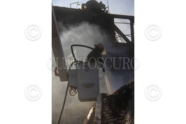 GUADALAJARA, JALISCO, 05MAYO2014.- Personal de Protección Civil de Jalisco y Bomberos de Guadalajara continúan con las labores para sofocar completamente las llamas del Mercado Corona ya que hasta el momento autoridades señalan que se encuentra controlado a un 60 por ciento y que trabajan de manera paulatina ya que existe el riesgo de que dicho inmueble colapse totalmente. Hasta el momento se estima que alrededor de 750 locatarios del Mercado han sido afectados por el siniestro que comenzó la noche del domingo. FOTO: FERNANDO CARRANZA GARCIA /CUARTOSCURO.COM
