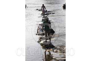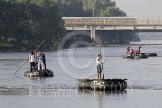SUCHIATE, CHIAPAS., 05MAYO.- Leche, azúcar, gasolina, harina, ropa, migrantes, armas, droga… de todo y a todas horas, esta “mercancía” es transportada por la el río Suchiate, Chiapas, frontera natural entre México-Guatemala, a espaldas del puente fronterizo y sin dar vista a la estación aduanal. Desde temprano por la mañana, y hasta que se oculta el sol, cientos de balseros utilizan una plataforma de madera montada sobre cámaras de trailers, para transportar personas y mercancía de un lado a otro de la frontera. Este paso fronterizo natural –paralelo a la aduana formal que el gobierno de México instaló el puente llamado Tecun Uman, ha sido utilizado ancestralmente como zona de transporte y paso entre las dos naciones. FOTO: ELIZABETH RUIZ /CUARTOSCURO.COM
