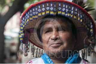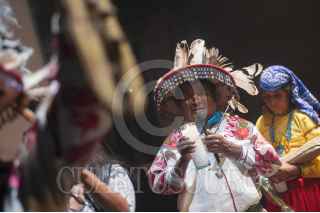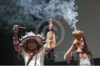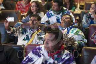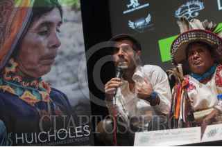 MÉXICO, D.F., 07MAYO2014.- Familia de la comunidad Wixárika y la productora Paola Stefani, durante la presentación del largometraje documental independiente "Huicholes: los últimos guardianes del peyote", una historia acerca del Pueblo Wixárika (huichol), cultura originaria del oeste central de México en la Sierra Madre Occidental y su lucha contra corporaciones transnacionales mineras por preservar Wirikuta, su territorio más sagrado, tierra donde crece el peyote. Durante el evento asistieron algunos huicholes protagonistas de la película. FOTO: DIEGO SIMÓN SÁNCHEZ /CUARTOSCURO.COM