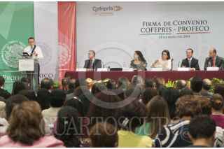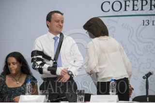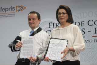 MÉXICO, D.F., 13MAYO2014.- Mikel Arriola, titular de la Comisión Federal para la Protección contra Riesgos Sanitarios (COFEPRIS) y Lorena Martínez, Procuradora Federal del Consumidor (PROFECO), encabezaron una firma de convenio entre estas dependencias de gobierno para implementar acciones conjuntas y coordinadas que pongan alto a la publicidad engañosa. FOTO: DIEGO SIMÓN SÁNCHEZ /CUARTOSCURO.COM