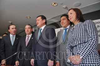 MÉXICO, D.F., 22MAYO2014.- Miguel Ángel Osorio Chong, secretario de Gobernación, se reunió con las comisiones de gobernación y seguridad del Senado de la República, en la imagen se observa al funcionario con Emilio Gamboa Patrón, coordinador de los priístas, Raúl Cervantes Andrade, presidente del Senado, Jorge Luis Preciado, coordinador de los panistas y Cristina Díaz, senadora presidenta de la comisión de gobernación. FOTO: MOISÉS PABLO /CUARTOSCURO.COM