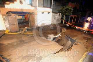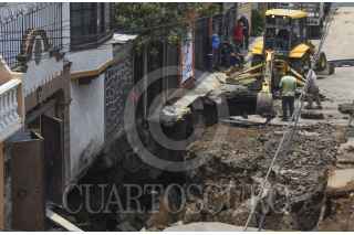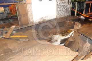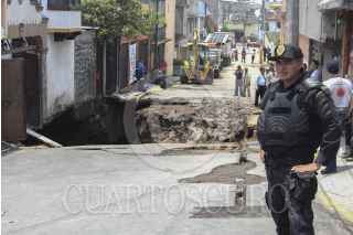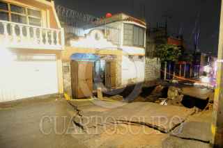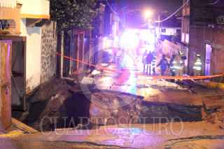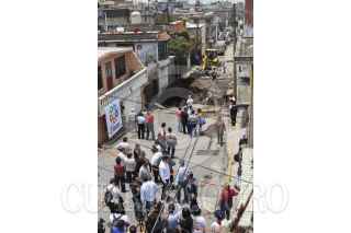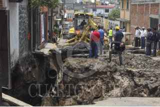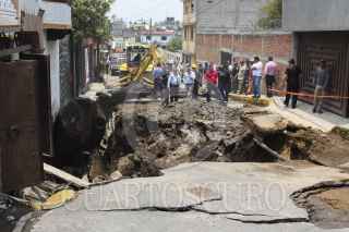 MÉXICO, D.F., 22MAYO2014.- Jesus Valencia delegado en Iztalapa y Miguel Ricaño Escobar, director del Sistema de Aguas de la Ciudad de México, mencionaron que al menos una semana de trabajos tardaran en reparar el que un tubo de 20 pulgadas de diámetro de la red primaria de agua potable que provocó un socavón de 25 metros de largo por 8 de ancho y 12 metros de profundidad, ubicado en la calle Águila Blanquinegra esquina con Jacobo Watts, colonia Pueblo de San Simón Culhuacán. FOTO: SAÚL LÓPEZ /CUARTOSCURO.COM