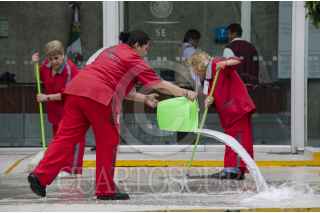 MÉXICO, D.F., 28MAYO2014.- Integrantes del Frente Auténtico del Campo ingresaron a las instalaciones de la Secretaría de Economía ubicada en la colonia Condesa, para protestar en contra de la aprobación de la Reforma Agraria. Como ejemplo de su descontento, arrojaron huevos a la fachada principal del inmueble y rompieron el cristal de la entrada. Personal de limpieza trabaja para no dejar pista de lo sucedido. FOTO: MARÍA JOSÉ MARTÍNEZ /CUARTOSCURO.COM