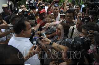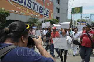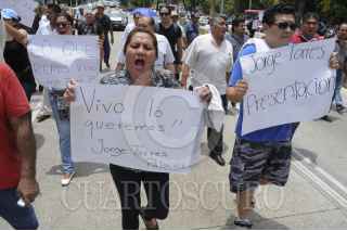 ACAPULCO, GUERRERO, 30MAYO2014.- Periodistas y familiares del comunicador Jorge Torres Palacios, quien presuntamente fue secuestrado ayer en la Unidad Habitacional El Coloso, el comunicador se desempeñaba como vocero de la Secretaría de Salud del Puerto, marcharon para pedir que las autoridades tomen cartas en el asunto, el contingente se dirigió hacia las instalaciones de la PGEJ, a la cual esta prohibido el acceso para los periodistas motivo por lo que fueron atendidos en la puerta. La PGJE anunció que la investigación es llevada a través de la Fiscalía Regional de Acapulco, proseguirá con las investigaciones a efecto de lograr ubicar y rescatar al funcionario que fue privado de su libertad. Los informadores también abordaron a Luis Walton, presidente municipal de Acapulco, para pedirle su intervención. En la imagen la esposa del Torre Palacios, Maribel Helguera Jiménez, llora desesperada. FOTO: BERNANDINO HERNÁNDEZ /CUARTOSCURO.COM