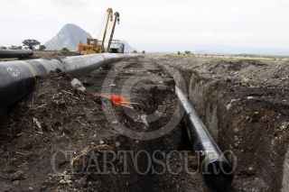 COEHUECÁN, PUEBLA, 30MAYO2014.- Resguardados por el Ejército Mexicano, la Policía Federal y Estatal, maquinaria y tubería arribaron el día martes a distintas comunidades del valle de Atlixco de Puebla con lo que oficialmente se dio inicio a la instalación del gasoducto Morelos, parte del Proyecto Integral Morelos mismo que fue asignado a las empresas españolas Enagás y Elecnor y que alimentará a dos termoelétricas mediante un gasoducto que atravesará los estados de Puebla, Morelos y Tlaxcala. A pesar de que en algunos municipios los ejidatarios han concedido permiso para que el gasoducto atraviese sus terrenos, muchos más se mantiene en contra al asegurar que representa un gran peligro para los ciudadanos debido a la cercanía con las poblaciones además de estar dentro de la zona de riesgo por la actividad volcánica; en consecuencia con la insatisfacción y protesta de algunas organizaciones sociales, en el mes de abril fueron encarcelados los líderes sociales Enedina Rosas Vélez, comisaría Ejidal de San Felipe Xonacayucan, Atlixco, y Juan Carlos Flores Solís, vocero del Frente de Pueblos en Defensa de la Tierra y el Agua de Puebla, Tlaxcala y Morelos (FPDTAPTM). FOTO: HILDA RÍOS /CUARTOSCURO.COM