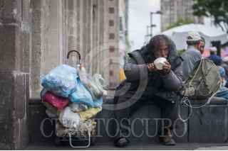 MÉXICO, D.F., 01JUNIO2014.- Una persona en situación de calle disfruta de una comida mientras mira el pasar de la gente que camina sobre la calle Juarez del centro histórico. FOTO: DIEGO SIMÓN SÁNCHEZ /CUARTOSCURO.COM