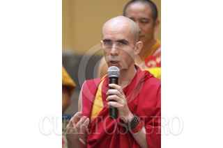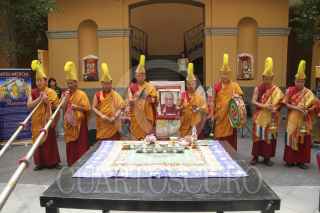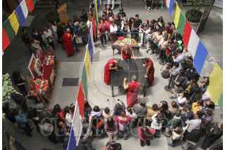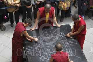 MÉXICO, D.F., 04JUNIO2014.- En el Palacio de la Autonomía de la UNAM, monjes tibetanos realizan un Mandala con arena de colores, además de dar una muestra de sus tradiciones sagradas con cantos tradicionales tibetanas para promover la paz. La pintura con arena de colores, denominada dul-tson-kyil-khor, que significa Mandala de "polvos de colores" es una de las tradiciones artísticas más importantes del budismo tántrico y el cual será terminado el próximo domingo. FOTO: ADOLFO VLADIMIR /CUARTOSCURO.COM