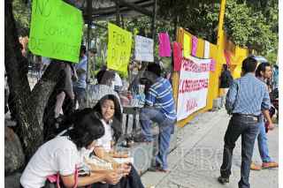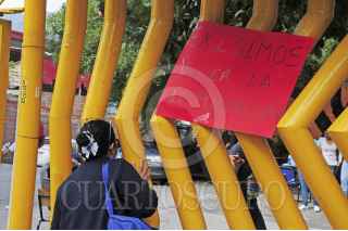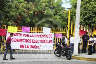 CHILPANCINGO, GUERRERO, 04JUNIO2014.- Estudiantes de la Unidad Académica de la Universidad Autónoma de Guerrero (UAGro), se manifestaron nuevamente en contra del pasado proceso electoral, en el que acusan al Rector Javier Saldaña Almazán de haber manipulado el proceso. Los participantes exigieron una elección extraordinaria y colocaron mantas y pancartas que expresaban el deseo por la anulación de las elecciones. Frente a la entrada de la institución colocaron una manta del Frente por la Defensa de los Derechos Electorales de la UAGro. La ex candidata Blanca Estela Sánchez encabezó la manifestación. FOTO: JOSÉ I. HERNÁNDEZ /CUARTOSCURO.COM
