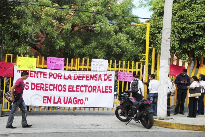 CHILPANCINGO, GUERRERO, 04JUNIO2014.- Estudiantes de la Unidad Académica de la Universidad Autónoma de Guerrero (UAGro), se manifestaron nuevamente en contra del pasado proceso electoral, en el que acusan al Rector Javier Saldaña Almazán de haber manipulado el proceso. Los participantes exigieron una elección extraordinaria y colocaron mantas y pancartas que expresaban el deseo por la anulación de las elecciones. Frente a la entrada de la institución colocaron una manta del Frente por la Defensa de los Derechos Electorales de la UAGro. La ex candidata Blanca Estela Sánchez encabezó la manifestación. FOTO: JOSÉ I. HERNÁNDEZ /CUARTOSCURO.COM