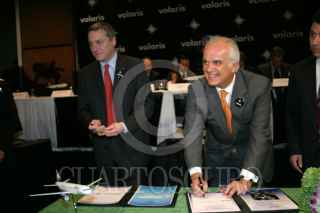MEXICO, D.F. 12ENERO2006.- Marco Antonio Slim y Enrique Peña Nieto, gobernador del Estado de México durante la presentación de la nueva línea aerea Volaris. FOTO: Nelly Salas/CUARTOSCURO.COM
