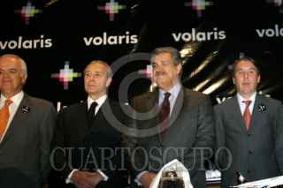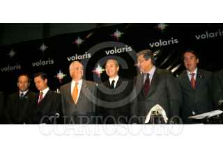 MEXICO, D.F. 12ENERO2006.- Fue presentada la aerolinea ¨Volaris¨ empresa que cuenta con la participacion de Marco Antonio Slim, Enrique Peña Nieto, gobernador del Estado de México, Pedro Aspe Armella, presidente del consejo de Administración de Volaris, Pedro Cerisola, secretario de Comunicaciones y Transportes y Rodolfo Elizondo, secretario de Turismo y Emilio Azcarraga, dueño de Televisa. FOTO: Nelly Salas/CUARTOSCURO.COM