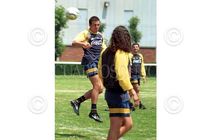 Ernesto Zedillo observa los regalos que le hicieron jugadores del club Toluca al término de la visita que realizó el equipo campeon del futbol mexicano a la residencia oficial de Los Pinos.