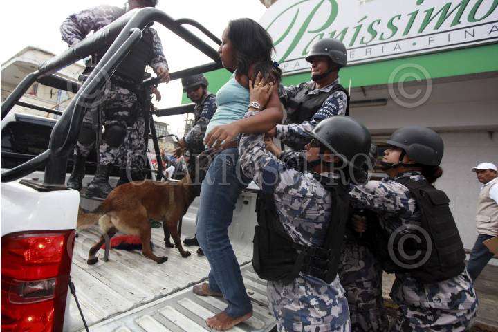 VERACRUZ, VERACRUZ, 10JUNIO2014.- Elementos antimotines de la Secretaría de Seguridad Pública y uniformados de la Policía Naval se enfrentaron contra un grupo de vendedores informales instalados en la conocida "zona cero" del área de mercados de esta ciudad. El conflicto se originó después de que los gendarmes trataron de desalojarlos del lugar. El saldo de la gresca fue de cinco personas detenidas con uso excesivo de la fuerza, entre ellas tres mujeres y un menor de edad. FOTO: FÉLIX MÁRQUEZ /CUARTOSCURO.COM