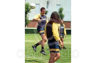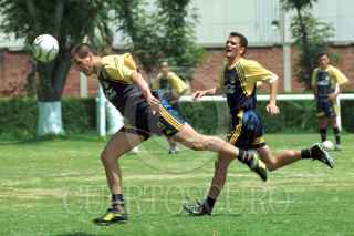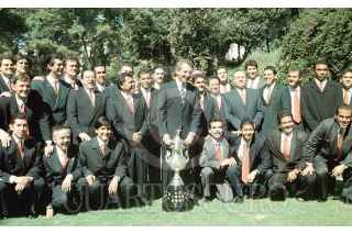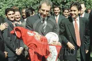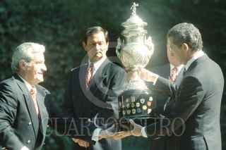 Ernesto Zedillo observa los regalos que le hicieron jugadores del club Toluca al término de la visita que realizó el equipo campeon del futbol mexicano a la residencia oficial de Los Pinos.