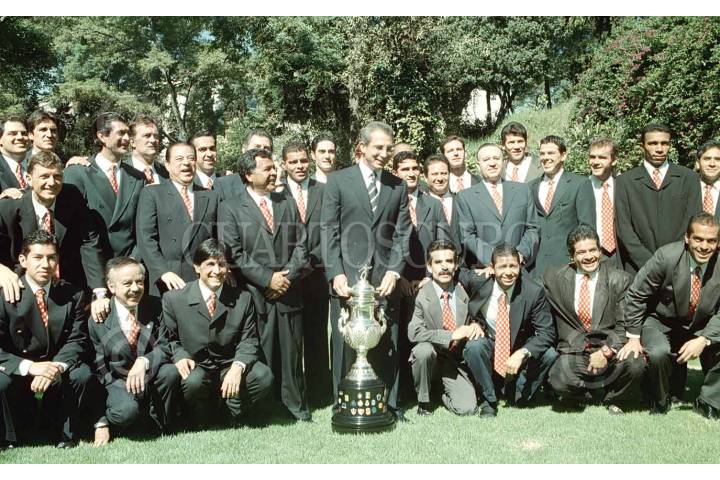 Ernesto Zedillo observa los regalos que le hicieron jugadores del club Toluca al término de la visita que realizó el equipo campeon del futbol mexicano a la residencia oficial de Los Pinos.
