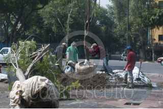 MÉXICO, D.F., 12JUNIO2014.- Como parte de la remodelación de la Glorieta de Cibeles, en la colonia Roma, trabajadores plantan arboles alrededor de la explanada. FOTO: DIEGO SIMÓN SÁNCHEZ /CUARTOSCURO.COM