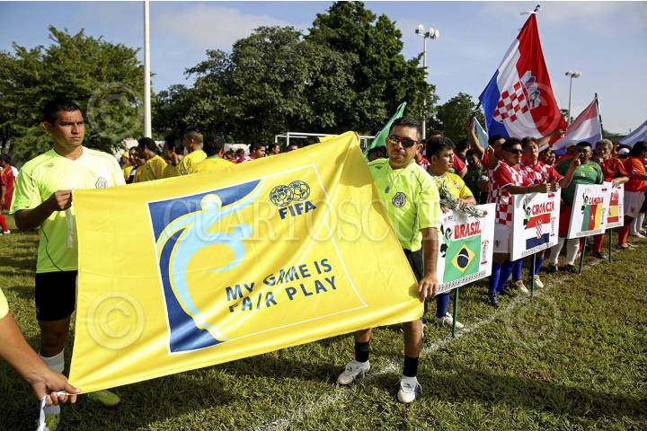 MÉXICO, D.F., 12JUNIO2014.- Con la fiebre del mundial, hoy se inauguró el "Mundialito 2014" en el cereso de Mérida en el cual participan 32 equipos integrados por los reos del penal; con la presentación de la mascota oficial "Cau-tivo" y una replica del Cristo del Corcovado de Brazil los 640 jugadores desfilaron con los uniformes representativos de cada país. FOTO: FRANCISCO BALDERAS /CUARTOSCURO.COM