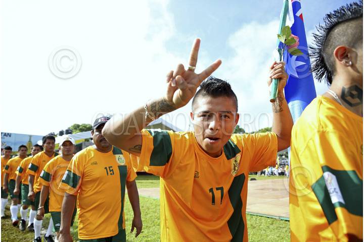 MÉXICO, D.F., 12JUNIO2014.- Con la fiebre del mundial, hoy se inauguró el "Mundialito 2014" en el cereso de Mérida en el cual participan 32 equipos integrados por los reos del penal; con la presentación de la mascota oficial "Cau-tivo" y una replica del Cristo del Corcovado de Brazil los 640 jugadores desfilaron con los uniformes representativos de cada país. FOTO: FRANCISCO BALDERAS /CUARTOSCURO.COM