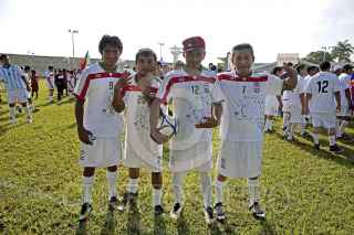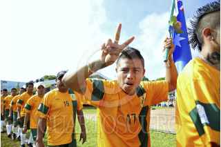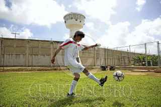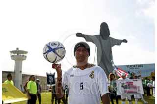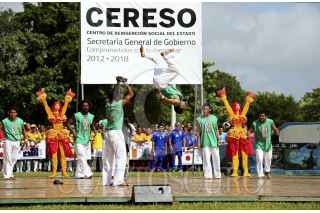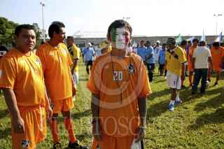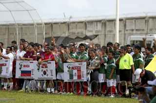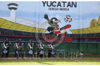 MÉXICO, D.F., 12JUNIO2014.- Con la fiebre del mundial, hoy se inauguró el "Mundialito 2014" en el cereso de Mérida en el cual participan 32 equipos integrados por los reos del penal; con la presentación de la mascota oficial "Cau-tivo" y una replica del Cristo del Corcovado de Brazil los 640 jugadores desfilaron con los uniformes representativos de cada país. FOTO: FRANCISCO BALDERAS /CUARTOSCURO.COM