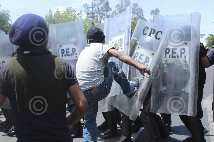 MORELIA, MICHOACÁN, 12JUNIO2014.- A toletazos el grupo de Operaciones Especiales rompió el plantón que sostenían indígenas de la comunidad de Capácuaro en la sede de Casa de Gobierno. Tras cuatro horas de plantón e insistencia de los comuneros, el cuerpo de seguridad recibió la orden para restablecer la circulación en el Libramiento Sur. Armados con piedras y palos, los comuneros la emprendieron contra los cuerpos policiacos, quienes a pie persiguen a los manifestantes sobre el Libramiento Sur con dirección hacia Costco. FOTO: JUAN JOSÉ ESTRADA SERAFÍN / CUARTOSCURO.COM