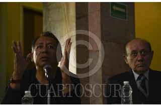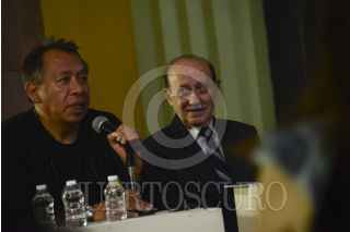 MÉXICO, D.F., 12JUNIO2014.- Los fotógrafos Enrique Metinides y Ernesto Ramírez y el especialista Jose Antonio Rodriguez, durante una conferencia en el marco de la muestra temporal Robert Doisneau, La belleza de lo cotidiano, en el área de murales, Bellas Artes. FOTO: PEDRO ANZA /CUARTOSCURO.COM