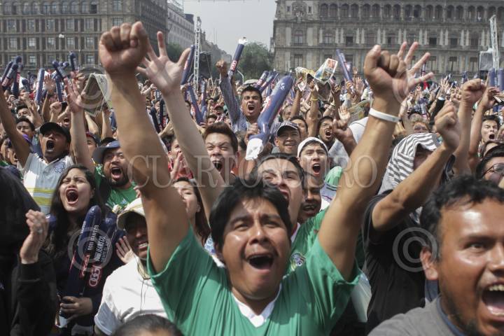 MÉXICO, D.F., 13JUNIO2014.- Aficionados se concentraron en la explanada del Zócalo para observar el partido entre México vs Camerún, en el marco del Mundial del Fútbol que se realiza en Brasil, los cientos de seguidores del llamado "tricolor" festejaron su triunfo con un gol anotado por Oribe Peralta. FOTO: MOISÉS PABLO /CUARTOSCURO.COM