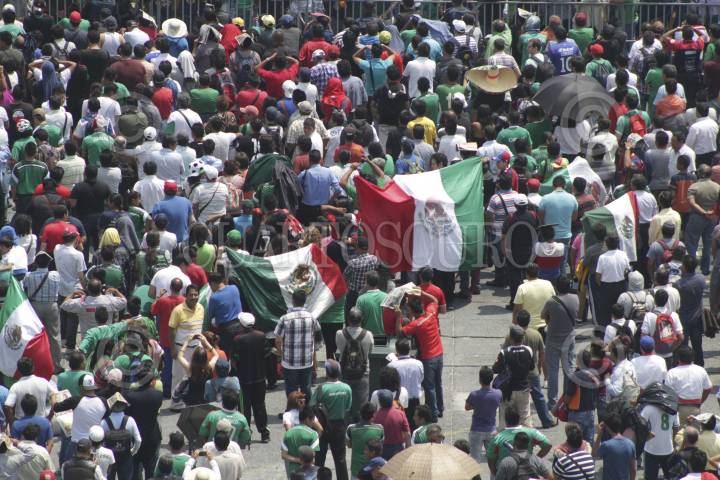 MÉXICO, D.F., 13JUNIO2014.- Aficionados se concentraron en la explanada del Zócalo para observar el partido entre México vs Camerún, en el marco del Mundial del Fútbol que se realiza en Brasil, los cientos de seguidores del llamado "tricolor" festejaron su triunfo con un gol anotado por Oribe Peralta. FOTO: MOISÉS PABLO /CUARTOSCURO.COM