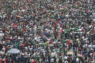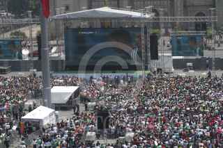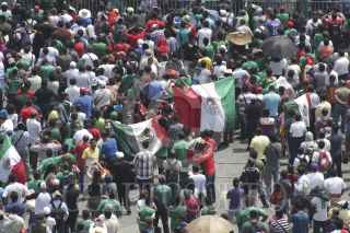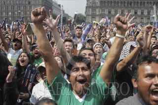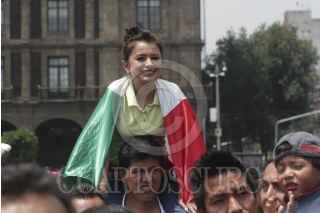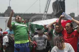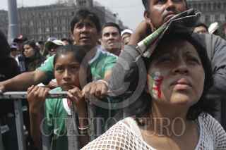 MÉXICO, D.F., 13JUNIO2014.- Aficionados se concentraron en la explanada del Zócalo para observar el partido entre México vs Camerún, en el marco del Mundial del Fútbol que se realiza en Brasil, los cientos de seguidores del llamado "tricolor" festejaron su triunfo con un gol anotado por Oribe Peralta. FOTO: MOISÉS PABLO /CUARTOSCURO.COM