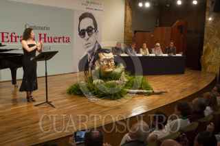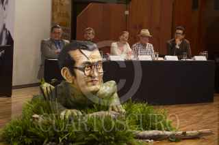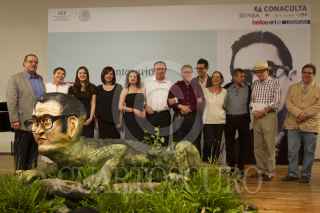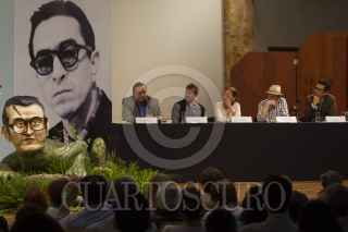 MÉXICO, D.F., 15JUNIO2014.- Jorge Fernández, Rafael Aviña, Mónica Mansour, Francisco Hernández y Julio Trujillo, durante la mesa de discusión para conmemorar el Centenario del poeta Efraín Huerta en la sala Manuel M. Ponce, del Palacio de Bellas Artes. FOTO: GUILLERMO PEREA /CUARTOSCURO.COM